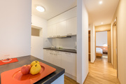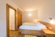 Sonnige Ferienwohnung Richtung Süden mit Doppelbettschlafzimmer. Küche ausgestattet mit Kühlschrank und Gefrierfach, Elektroherd mit vier Kochfelder, Backofen, Wasserkocher, Kaffeemaschine, Küchenutensilien. Wohnbereich mit Esstisch, ausziehbare Couch für eine Person, TV, Dusche/WC, Balkon mit Bergblick, Balkonmöbel.